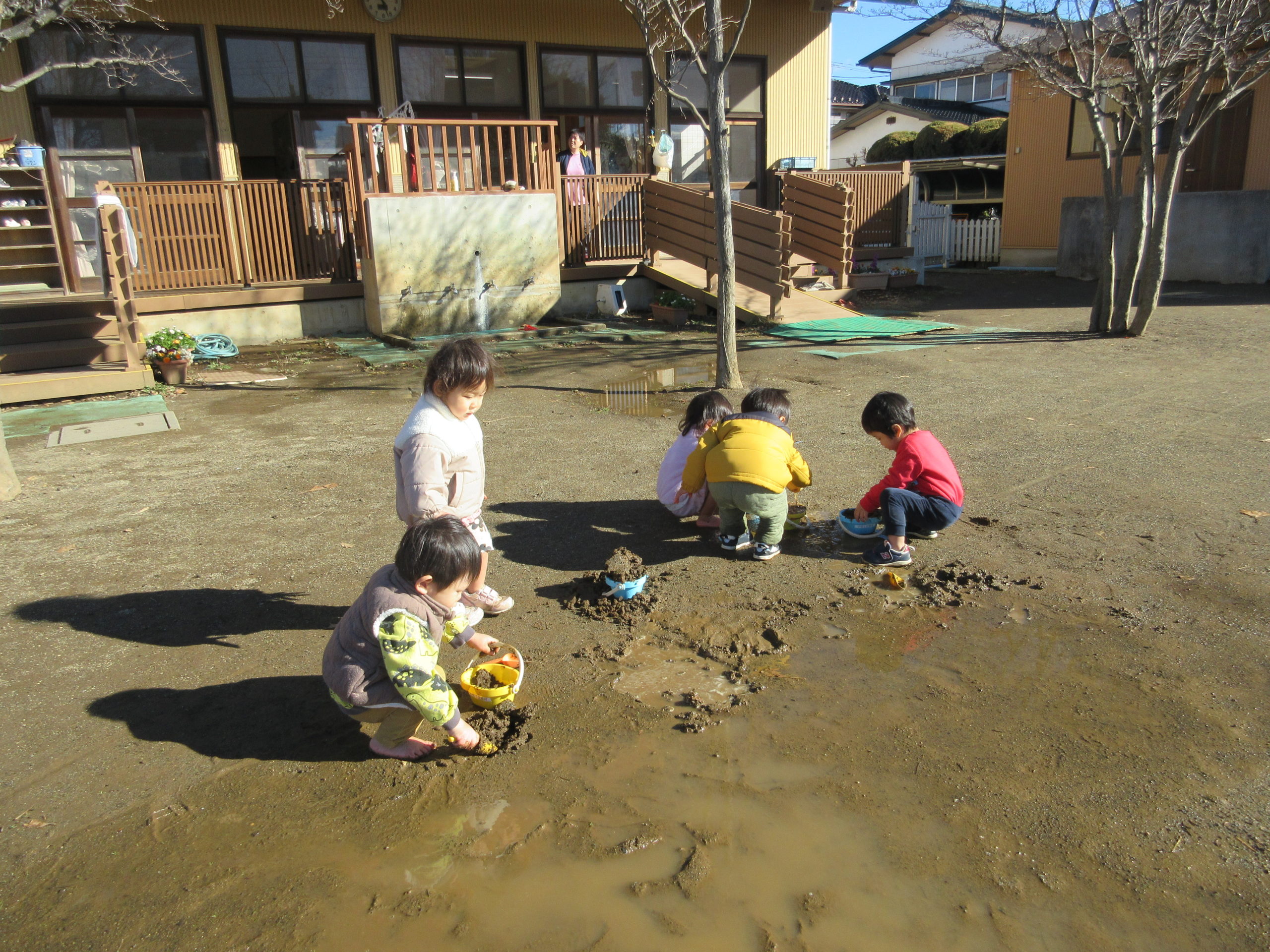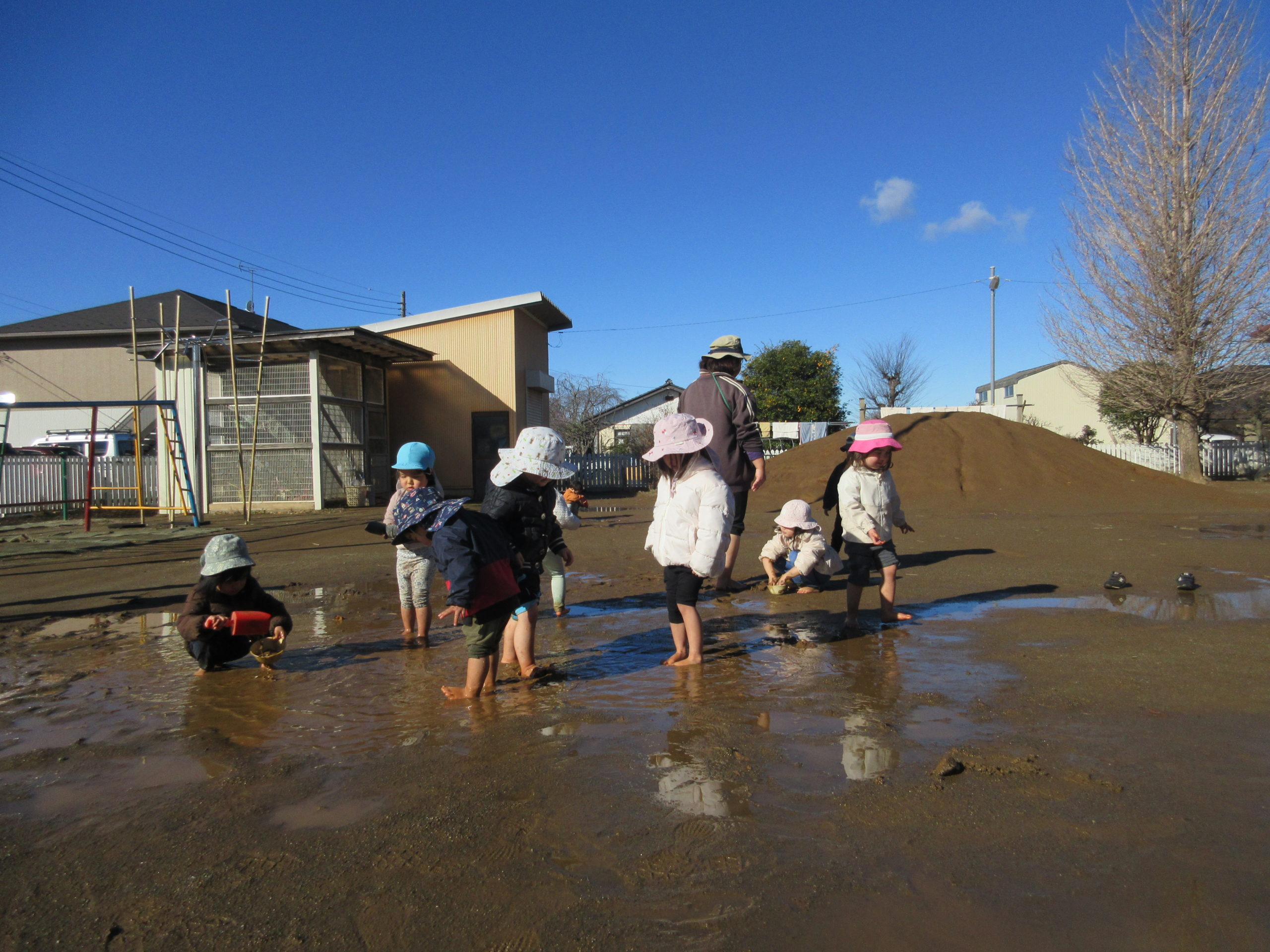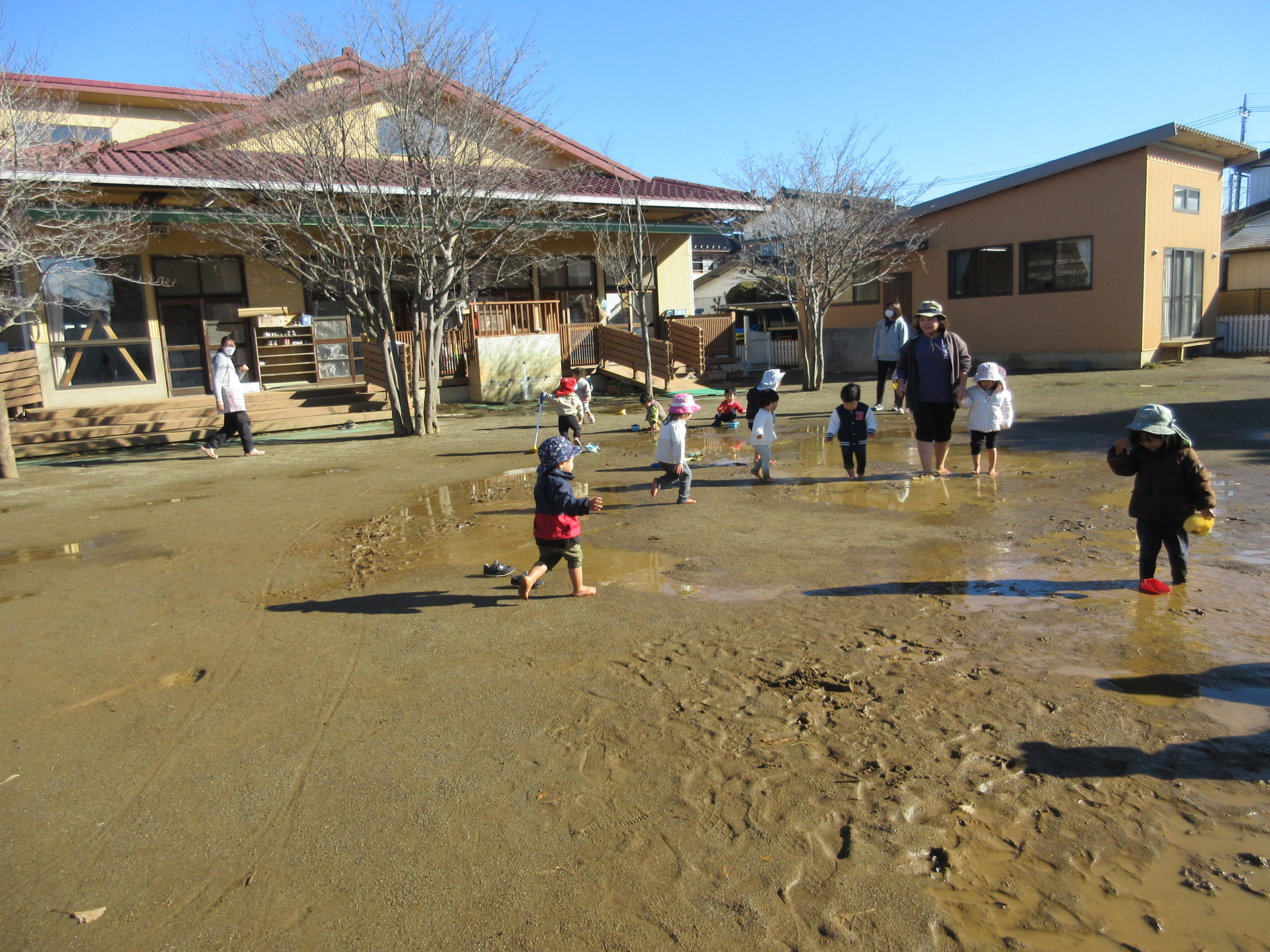 でも園庭は水たまり、おひさまはぽかぽか、、、
