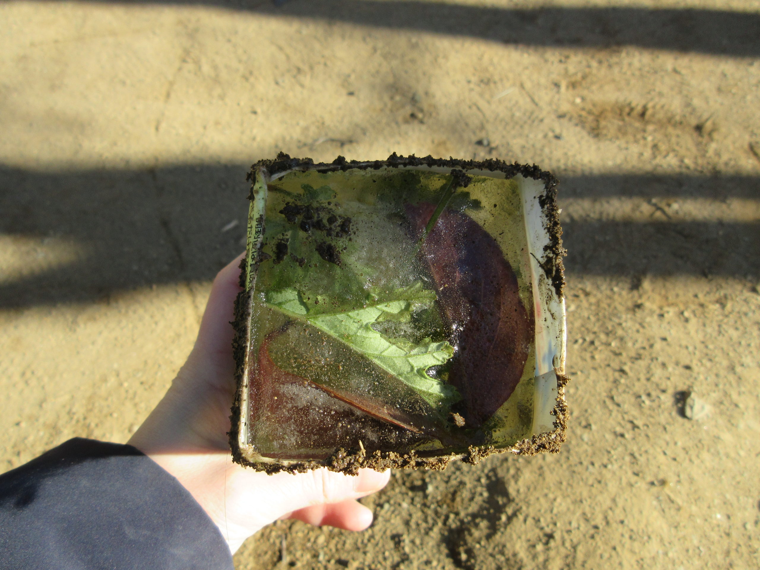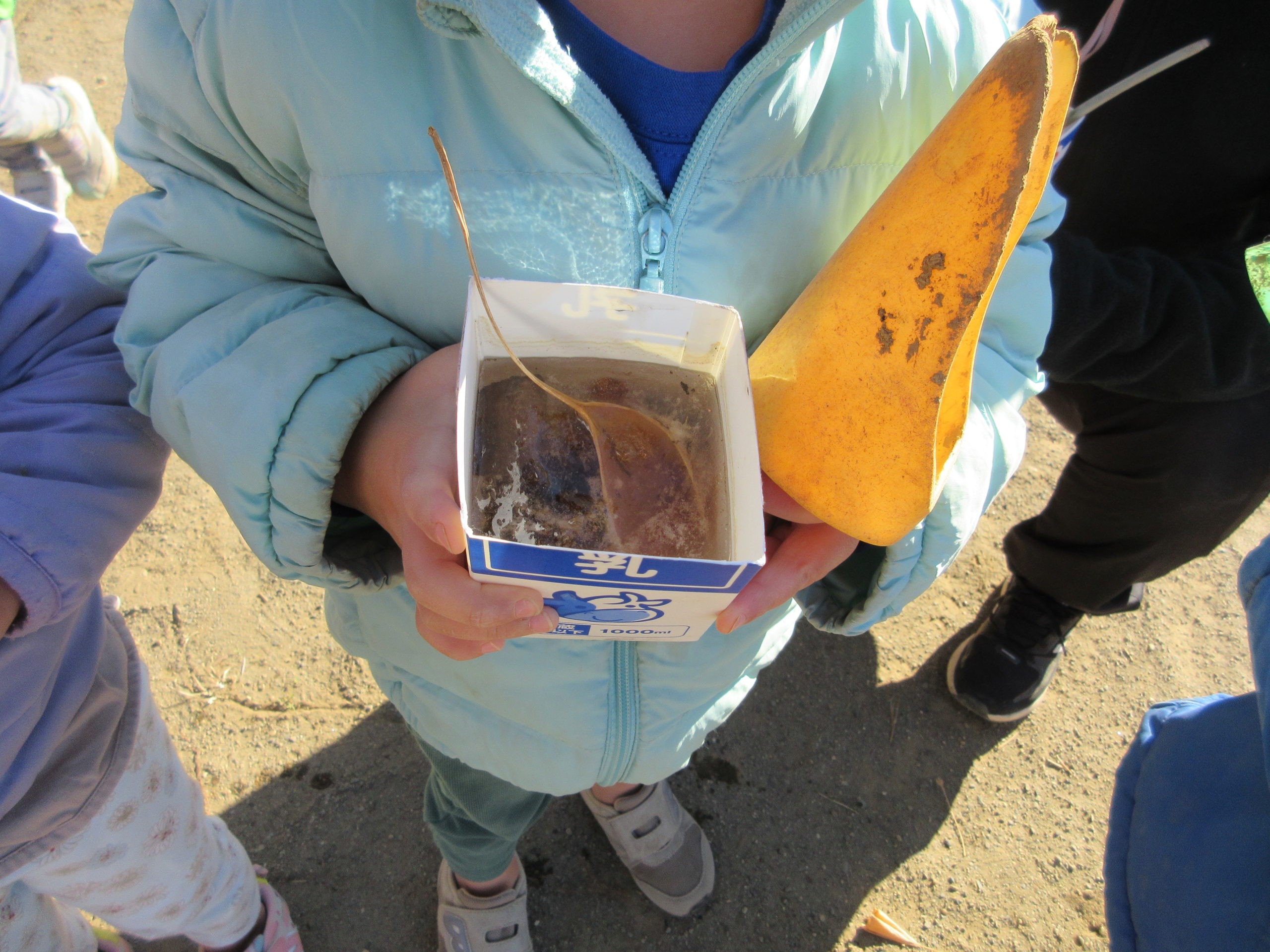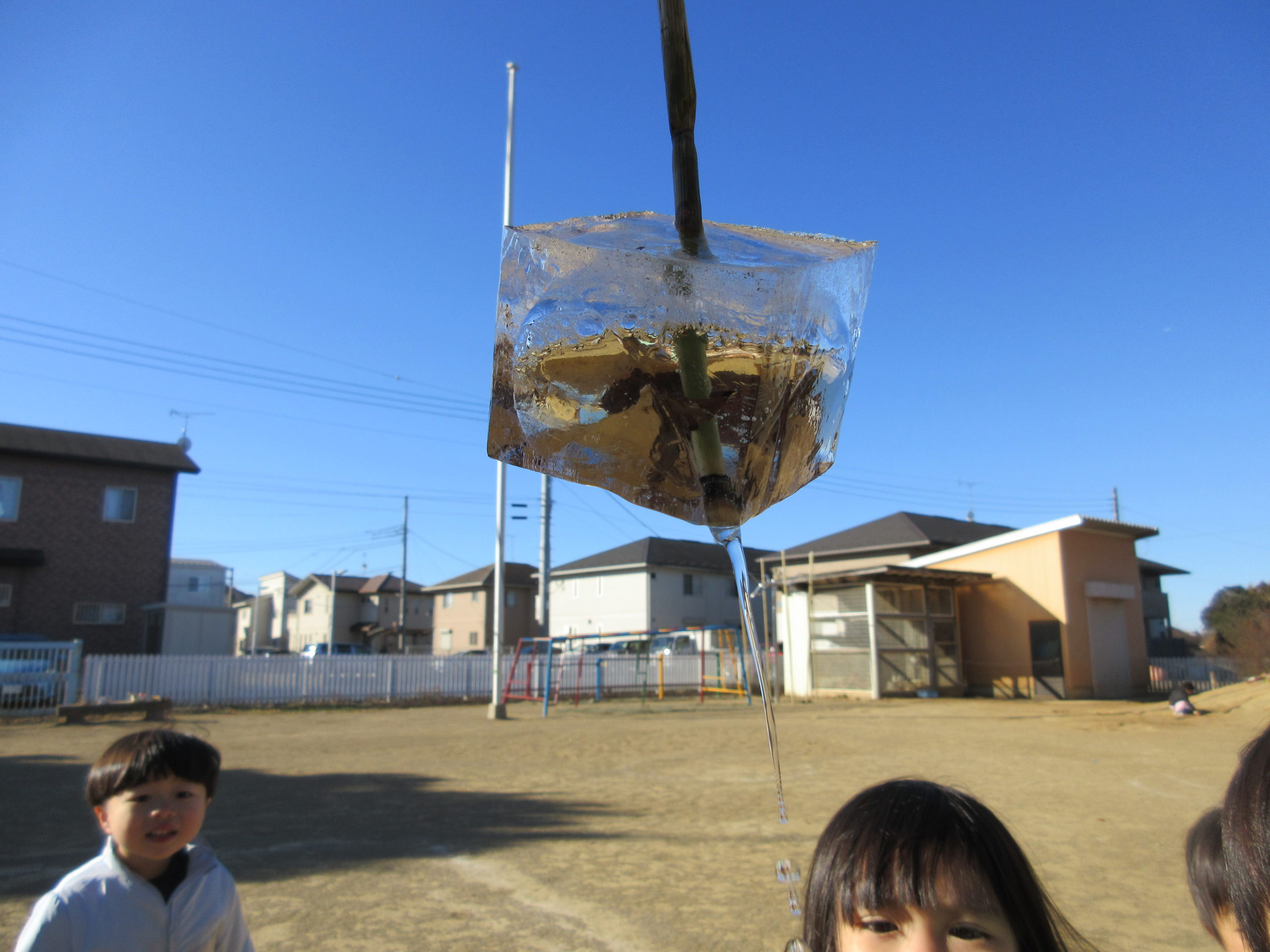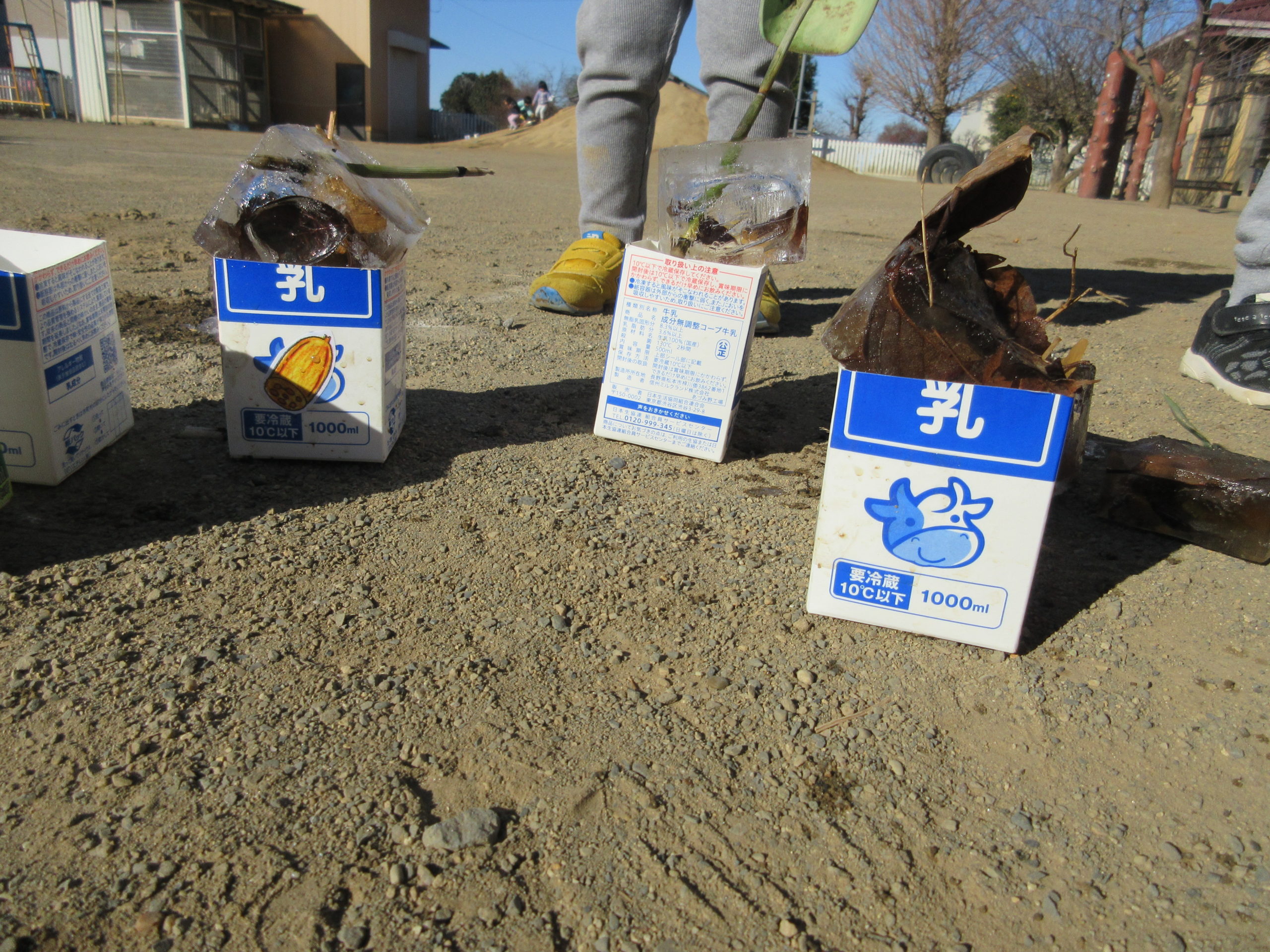園庭では霜が降りたり、氷が張ったりと冬らしい様子に